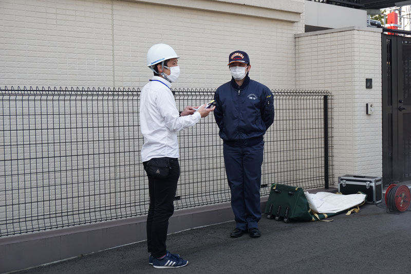 ▲火災現場を発見して初期消火を行います。