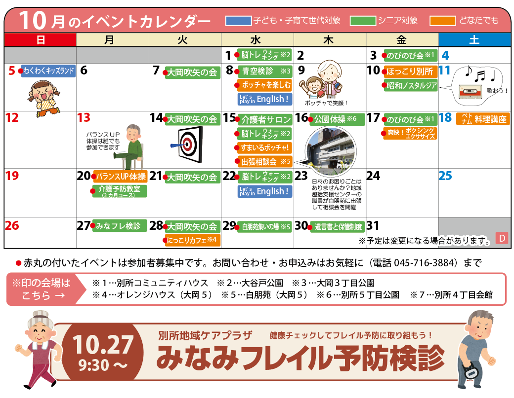2025年10月02日 2025年10月のイベントカレンダー 2025年10月のイベントカレンダーです。別所地域ケアプラザ主催の2025年10月(別所地域ケアプラザ主催の)イベントを一目でご覧いただけます。見落としなどありませんか?興味のあるイベントにはぜひご参加ください。クリックすると拡大して表示します。各イベントの詳しい情報は、ホームページの【新規情報 】のページからご覧いただけます。 カテゴリなしの他の記事 < 前の記事次の記事 > コメント コメントフォーム 名前 コメント 記事の評価 リセット リセット 顔 星 情報を記憶 コメントを投稿する